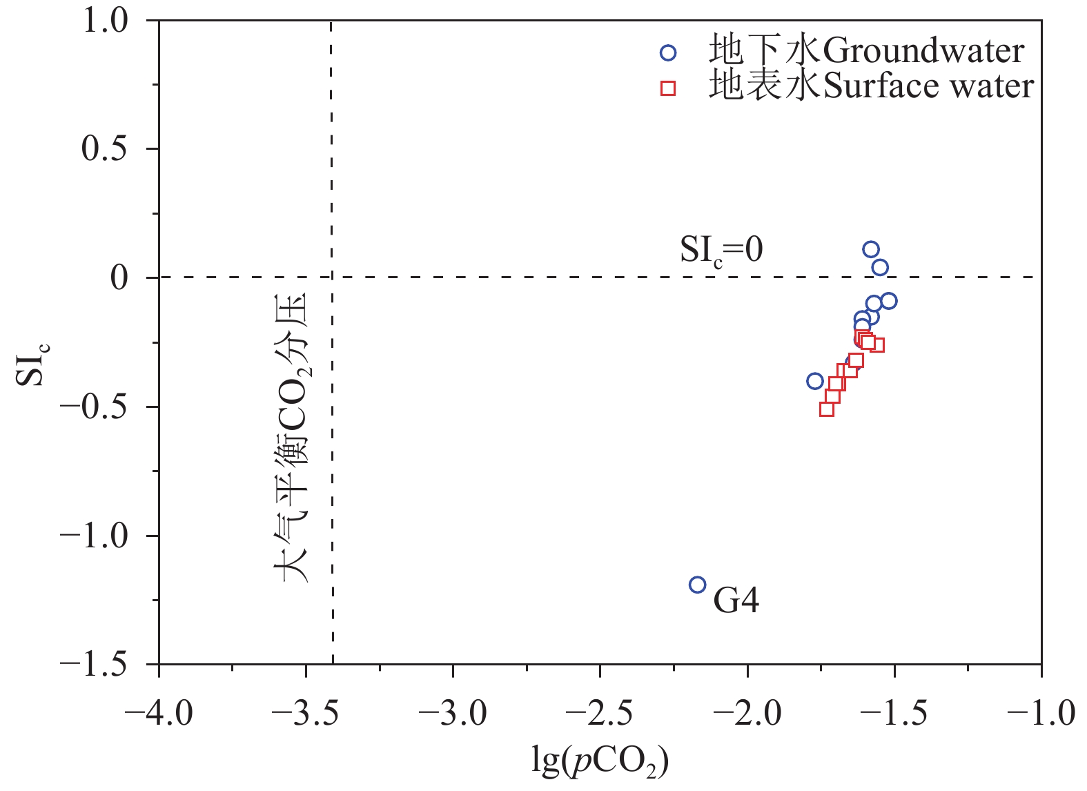 4.2 二氧化碳分压与碳酸钙饱和指数会仙岩溶湿地水体中二氧化碳分压(pCO2)变化范围为10−2.17~10−1.52 atm,均大于大气pCO2均值10−3.4 atm(图3),G8和G12地下水体碳酸钙饱和指数(SIc)大于0,其余水体碳酸钙饱和指数均小于0,SIc最小值为位于睦洞湖湖滨的G4民井,反映该井水尚具有较强的溶蚀能力。从图中还可以看出,水体lg(pCO2)越大,其SIc越大,表明水体pCO2影响着会仙湿地碳酸盐岩的溶解。