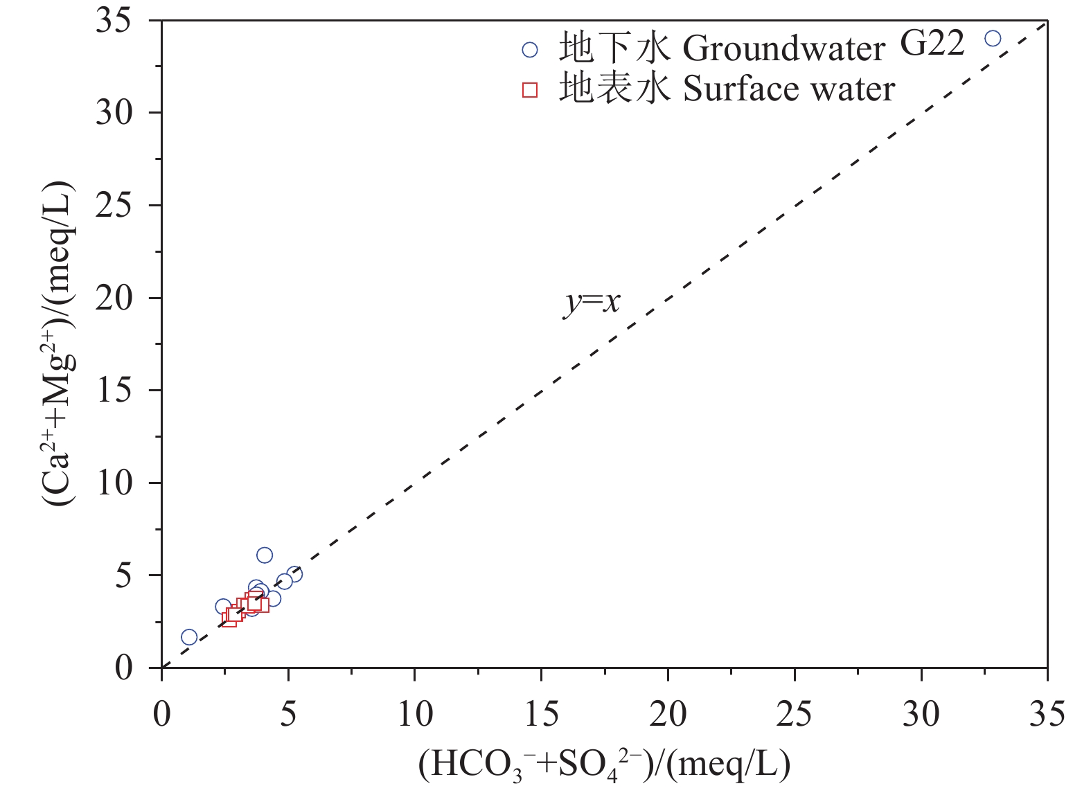 图 5 湿地水体(Ca2++Mg2+)与(HCO3−+SO42−)当量浓度关系 Fig. 5 Relationship between (Ca2++Mg2+) and (HCO3−+SO42−) equivalent concentration in wetland water |