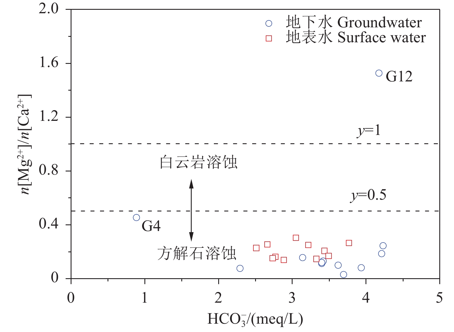 可知纯方解石达到溶解平衡时Mg2+与Ca2+摩尔比值n[Mg2+]/n[Ca2+]=0,纯白云岩达到平衡时n[Mg2+]/n[Ca2+]=1,根据研究区水体的n[Mg2+]/n[Ca2+]与HCO3−浓度的变化关系(图6)可知,大部分地下水和地表水Ca2+、Mg2+与HCO3−来源均表现一致性,主要来源于碳酸盐岩溶蚀,其中G4和G12与其他水体偏离较远,分析G4点是受到C1y和C1d地层中白云岩和白云质灰岩的影响,白云石类碳酸盐中的Ca2+和Mg2+逐渐被溶滤到地下水中;G12则是受到附近废弃硫铁矿的影响,微生物菌群参与下的硫铁矿氧化会形成大量的SO42−(式3),镁的碳酸盐和硫酸盐溶解度比钙高,而Mg2+不如Ca2+那么容易沉积。