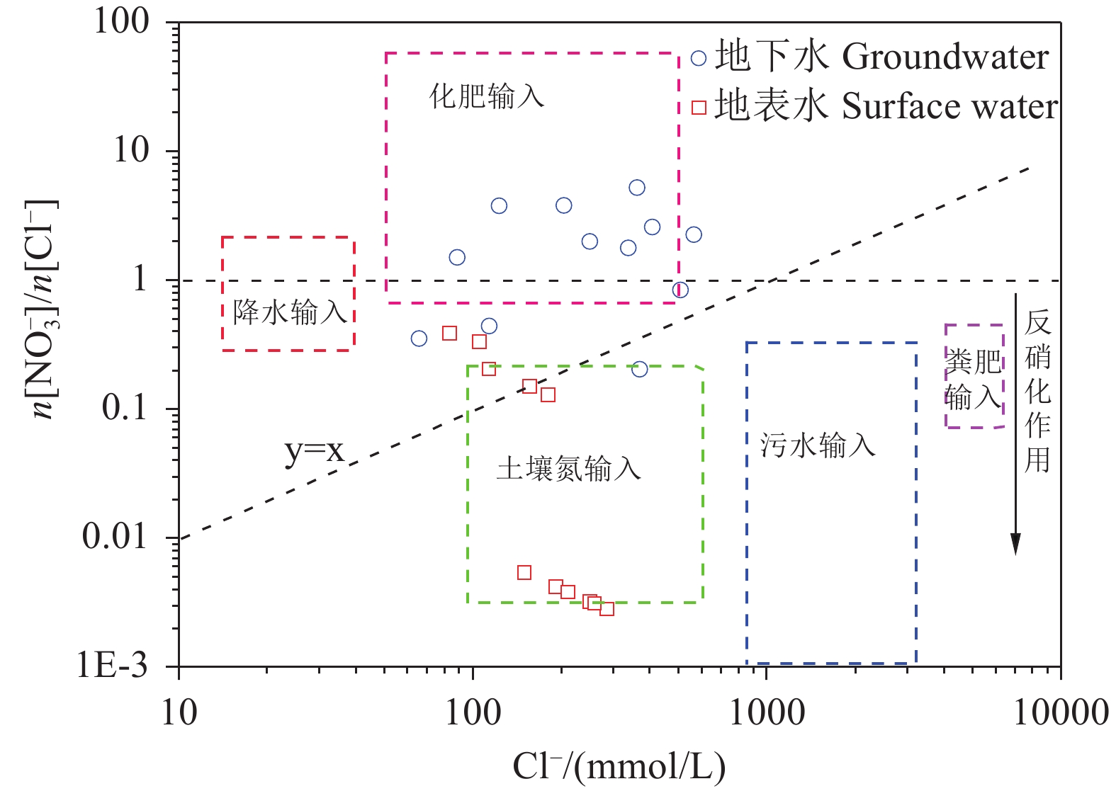 通常利用n[NO3−]/n[Cl−]来消除地下水浓缩作用或吸湿效应影响,结合n[NO3−]/n[Cl−]与Cl−浓度关系可识别地下水中NO3−来源(图7),图中可见湿地水体NO3−降水来源、污水来源和粪水来源较少,其主要来源为农业化肥和土壤有机氮的硝化。