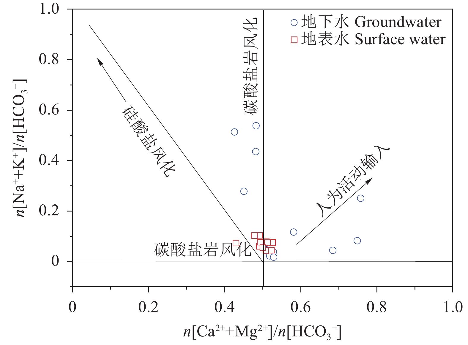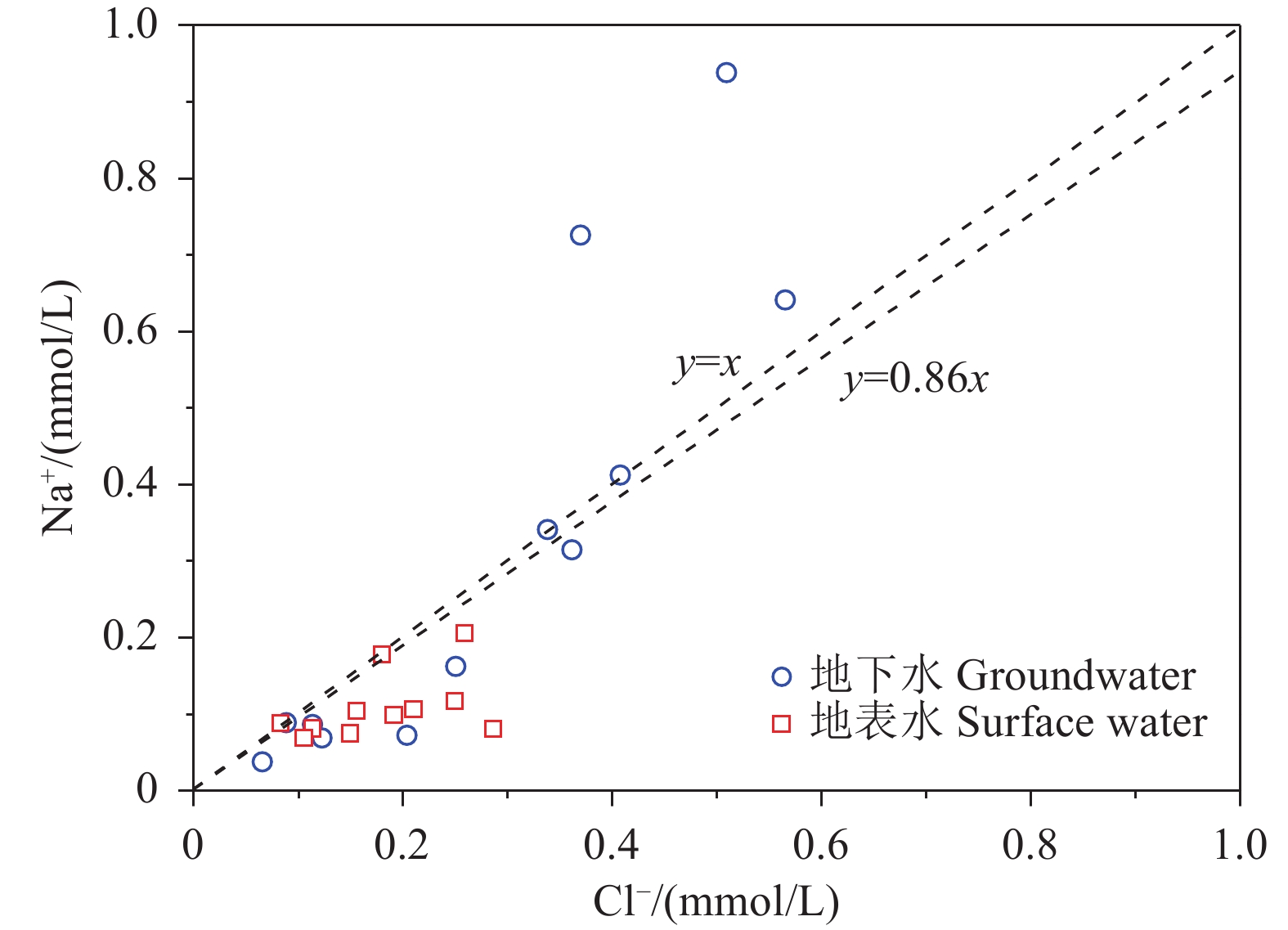 Na+与Cl−比值常用来判断水体Na+和Cl−来源,若水体中Na+和Cl−来自海洋气溶胶或盐岩溶解,n[Na+]/n[Cl−]值应为0.86或1(Li et al.,2010),从图8中可知,n[Na+]/n[Cl−]值大部分偏离0.86和1,所以降水和盐岩主要来源排除。