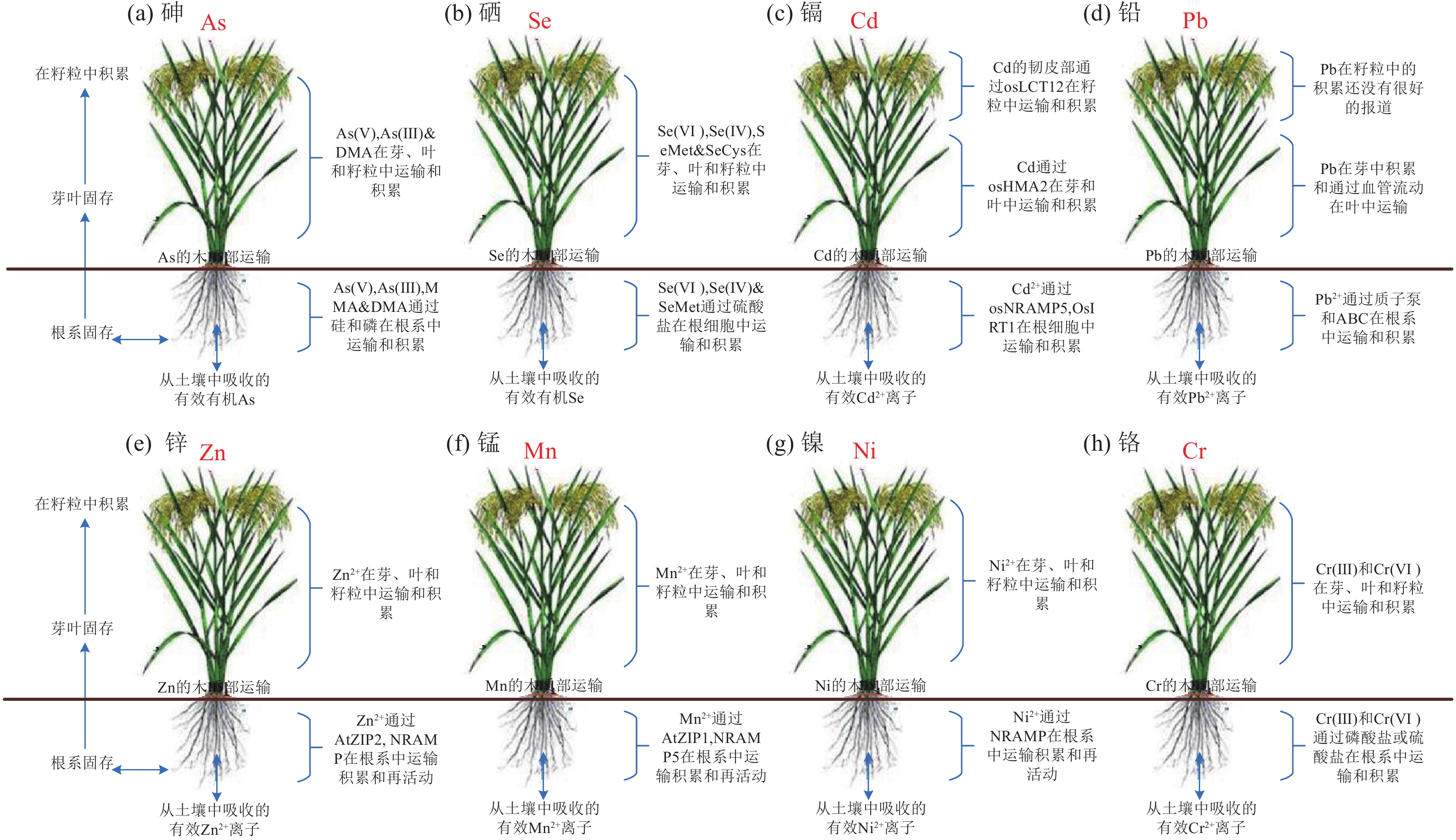 图 3 水稻土壤−籽实系统中微量元素的吸收、转运和积累机制(引自Ali et al.,2020) Fig. 3 Mechanisms of absorption, transport and accumulation of trace elements in the soil−seed system of rice (after Ali et al., 2020) |