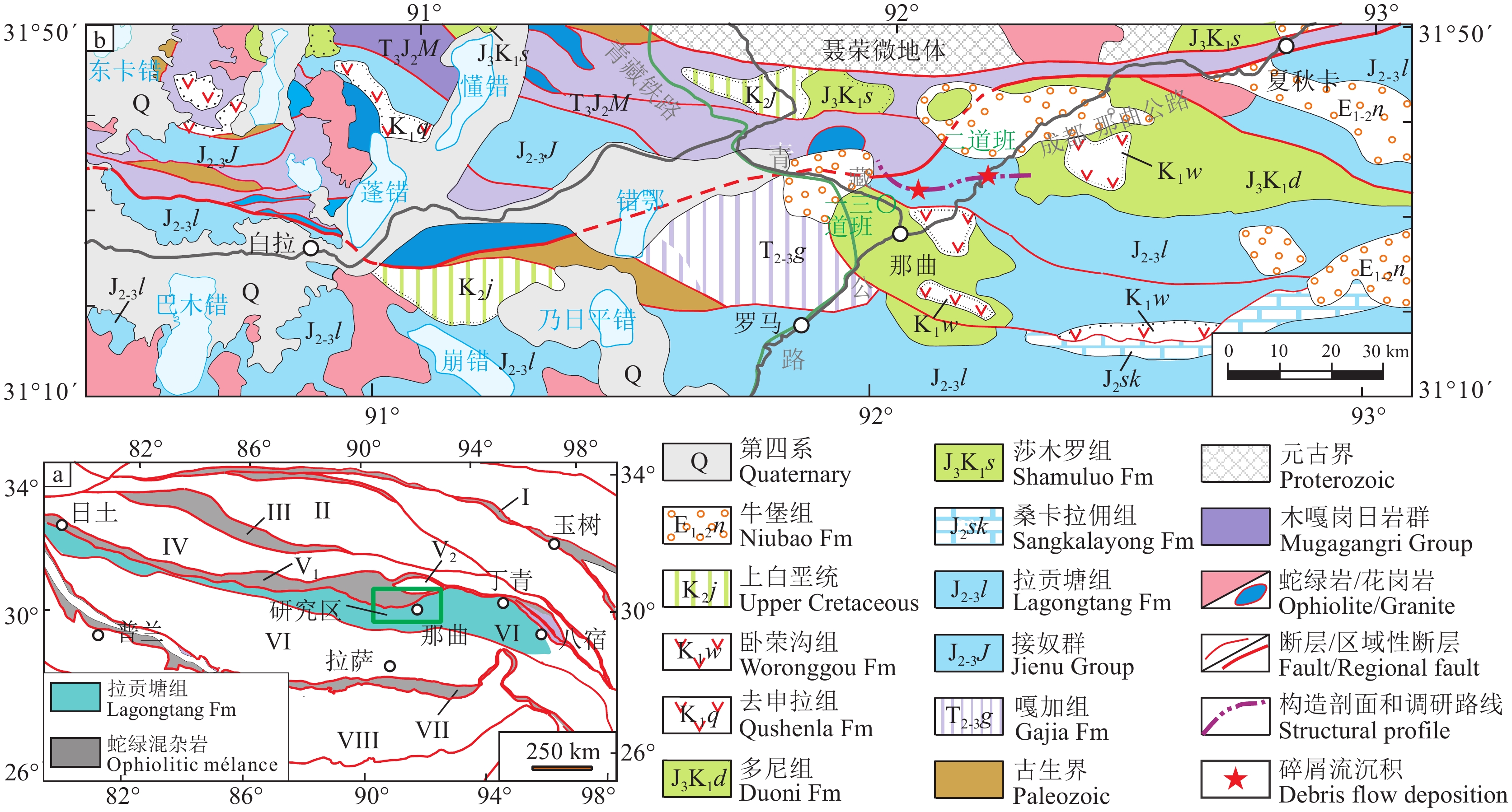 笔者对发育于西藏那曲县城北部、拉萨地块与班公湖―怒江结合带过渡部位的中上侏罗统拉贡塘组进行了实地调研(图1a),在成都―那曲公路二道班、青藏公路一三〇道班等地识别出深水碎屑流沉积(图1b),其内普遍发育滑塌体,可见滑动体。本文基于这些重力流沉积特征的分析,同时结合前人研究成果,研究其控制因素和沉积过程,进而建立了拉贡塘组深水碎屑流的沉积模式,其成果将对丰富重力流沉积理论、恢复青藏高原南部中生代构造−古地理和含油气盆地评价具有一定的意义。