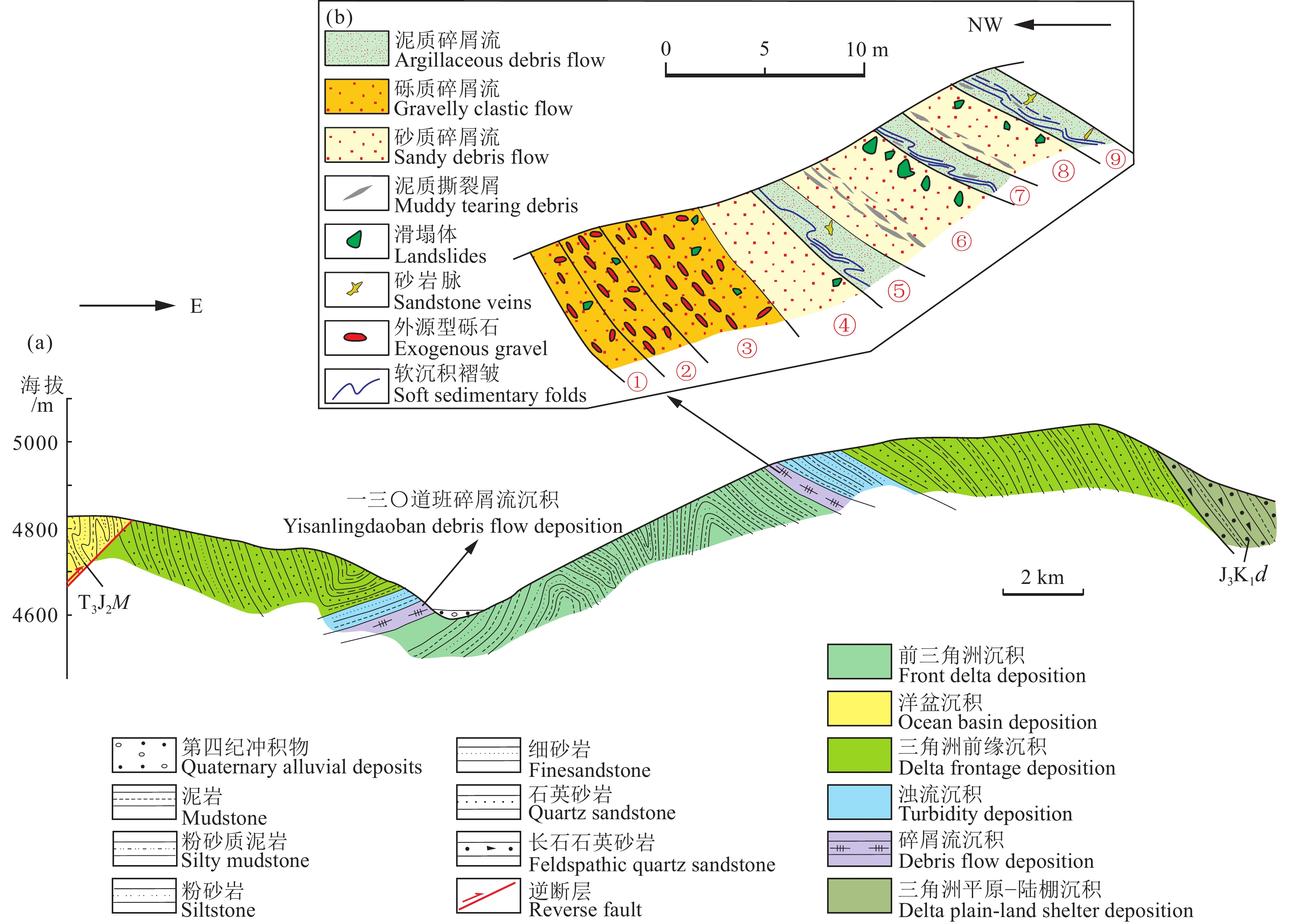 图 2 拉贡塘组构造剖面(a)和二道班碎屑流沉积剖面(b) T3J2M―木嘎岗日岩群;J3K1d―多尼组 Fig. 2 Structural profile of the Lagongtang Formation (a) and the section of the Erdaoban debris flow deposition (b) T3J2M−Mugagangri Group; J3K1d−Duoni Formation |