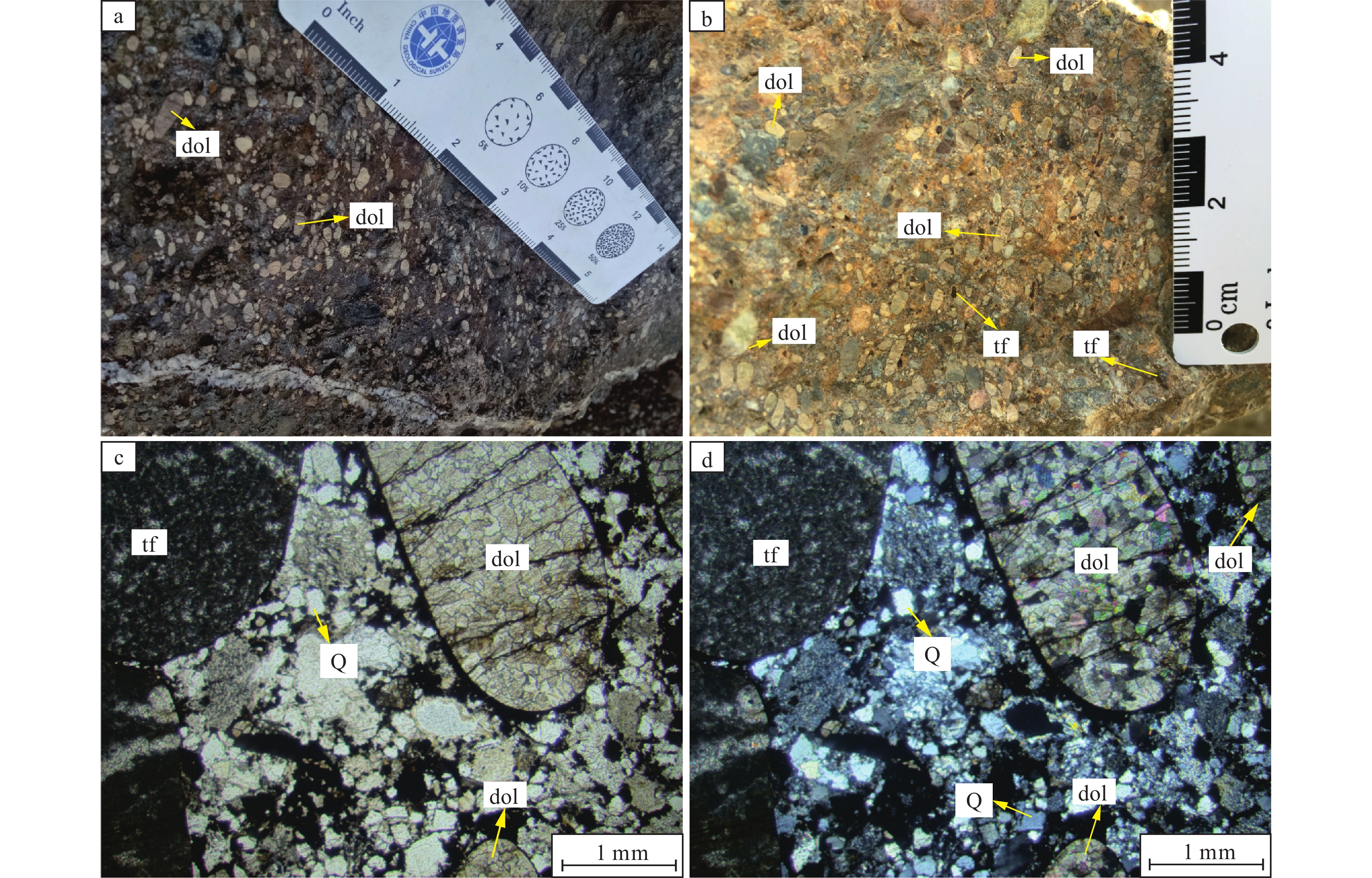 图 3 砾质碎屑流沉积的野外露头特征(a、b)及其单偏光(c)、正交偏光(d)显微构造图像 dol―白云质砾石;tf―凝灰质砾石;Q―石英 Fig. 3 Outcrop characterisitics (a,b), plainlight images (c) and crossed nicols images (d) of gravel debris flow deposition dol−Dolomitic gravel; tf−Tuffaceous gravel; Q−Quartz |