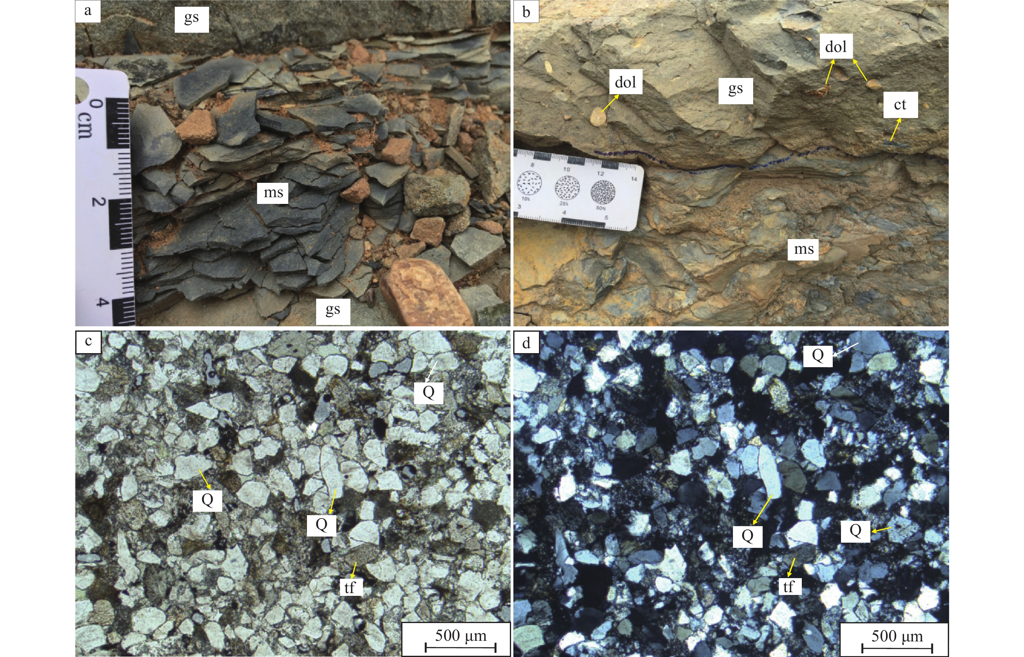 图 4 砂质碎屑流沉积野外露头特征(a、b)和单偏光(c)、正交偏光(d)显微构造图像 gs―含砾石英砂岩;ms―泥质杂砂岩;Q―石英;tf―岩屑;dol―白云质砾石;ct―泥质撕裂屑 Fig. 4 Outcrop characterisitics(a,b), plainlight images (c) and crossed nicols images (d) of sandy debris flow deposition gs−Gravelly quartz sandstone; ms−Muddy greywacke; Q−Quartz; tf−Lithiclast; dol−Dolomitic gravel; ct−Muddy tearing chips |