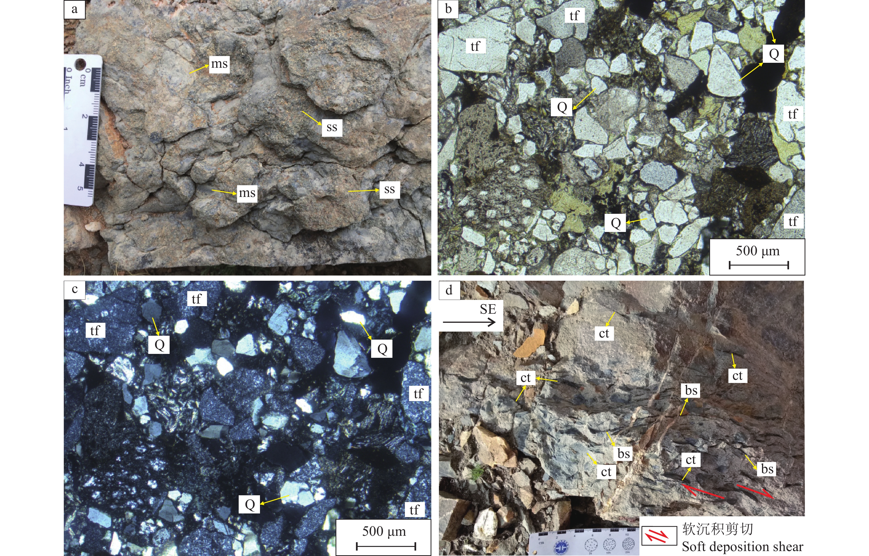 图 5 砂质碎屑流沉积的露头特征(a、d)和单偏光(b)、正交偏光(c)显微构造图像 ms―泥岩;ss―砂岩;Q―石英;tf―凝灰质岩屑;ct―泥质撕裂屑;bs―布丁构造 Fig. 5 Outcrop characterisitics(a,d), plainlight images (b) and crossed nicols images (c) of sandy debris flow deposition ms−Mudstone; ss−Sandstone; Q−Quartz; tf−Tufface cuttings; ct−Muddy tearing chips; bs−Pudding structure |