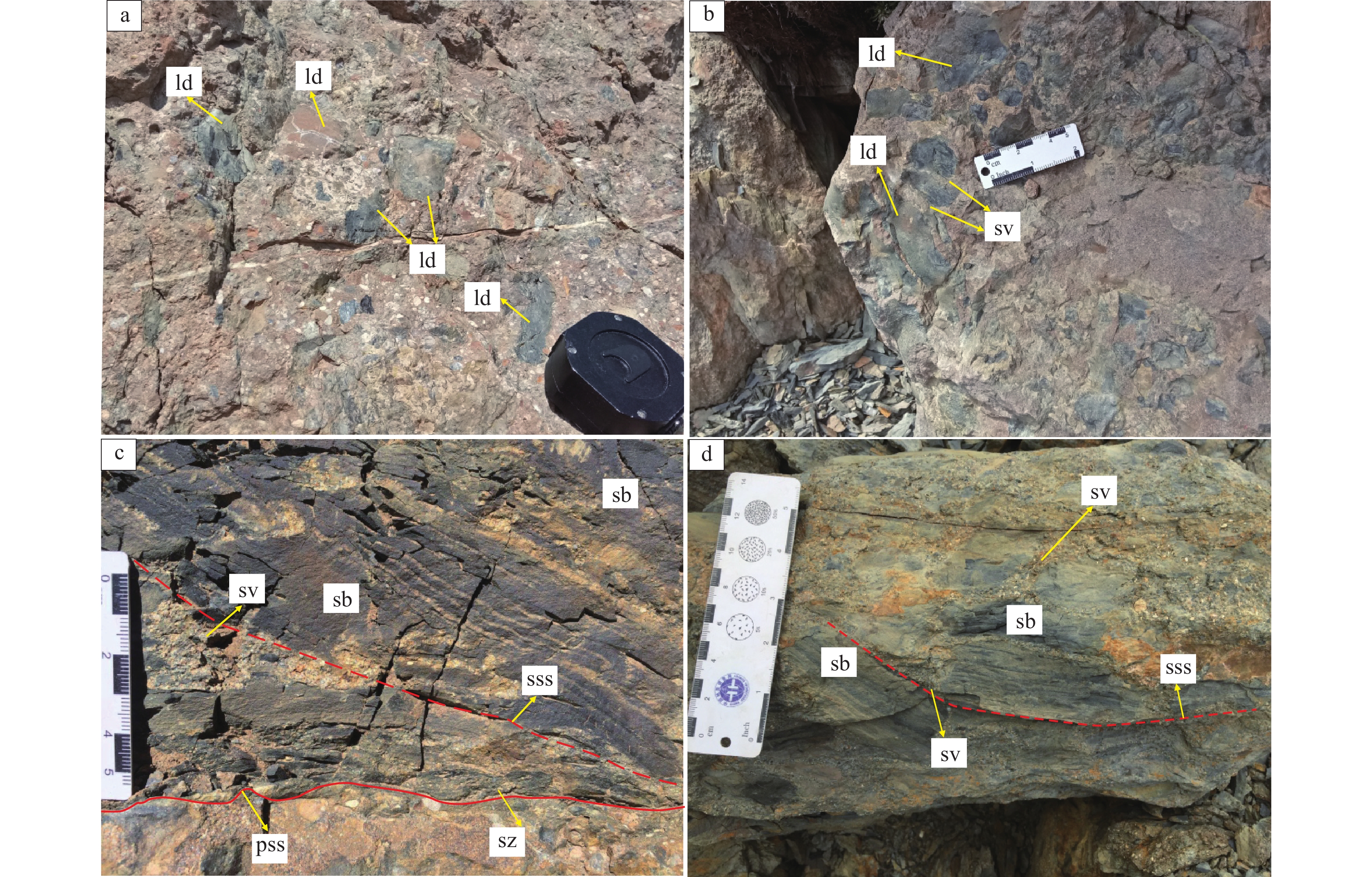图 6 二道班砂质碎屑流沉积中的滑塌体(a、b)和滑动体(c、d)露头特征 ld―滑塌体;sv―砂岩脉;sb―滑动体;pss―原始滑动面;sss―二次滑动面;sz―剪切带 Fig. 6 Outcrop characterisitics of the landslide (a,b) and sliders (c,d) of the Erdaoban sandy debris flow deposits ld−Landslides; sv−Sandstone veins; sb−Sliders; pss−Original sliding surface; sss−Secondary sliding surface; sz−Shear zone |