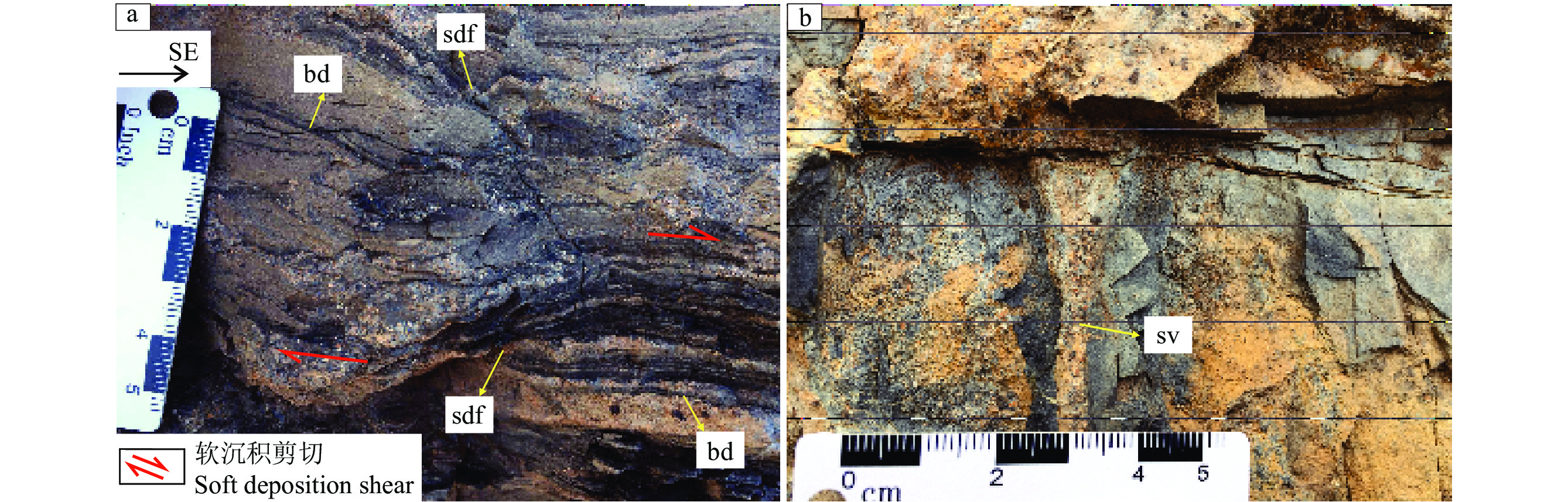 图 7 二道班泥质碎屑流沉积的层流(a)和筏流(b)沉积露头特征 sdf―软沉积变形褶皱;bd―布丁构造;ct―泥质撕裂屑;sv―砂岩脉 Fig. 7 Outcrop characterisitics of laminar flow (a) and raft flow (b) of the Erdaoban argillaceous debris flow deposition sdf−Soft−deposited deformation folds; bd−Pudding structure; ct−Muddy tearing chips; sv−Sandstone veins |