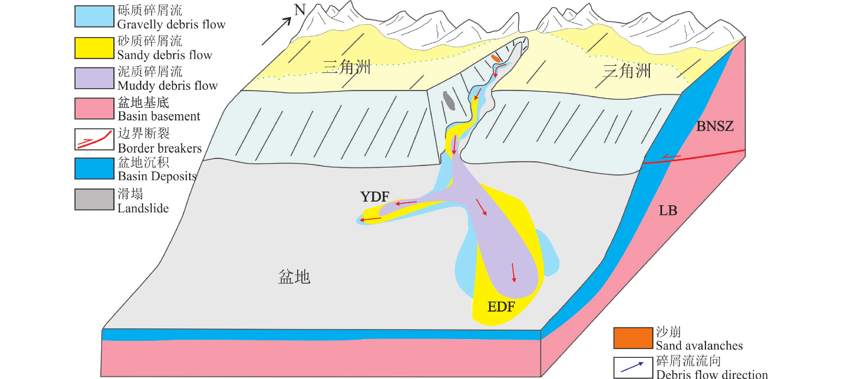 图 8 拉贡塘组碎屑流的沉积模式 BNSZ―班公湖—怒江结合带;LB―拉萨地块;EDF―二道班碎屑流;YDF―一三〇道班碎屑流 Fig. 8 Depositional model of debris flow of the Lagongtang Formation BNSZ−Bangonghu−Nujiang suture zone; LB−Lhasa block; EDF−Erdaoban debris flow; YDF−Yisanlingdaoban debris flow |