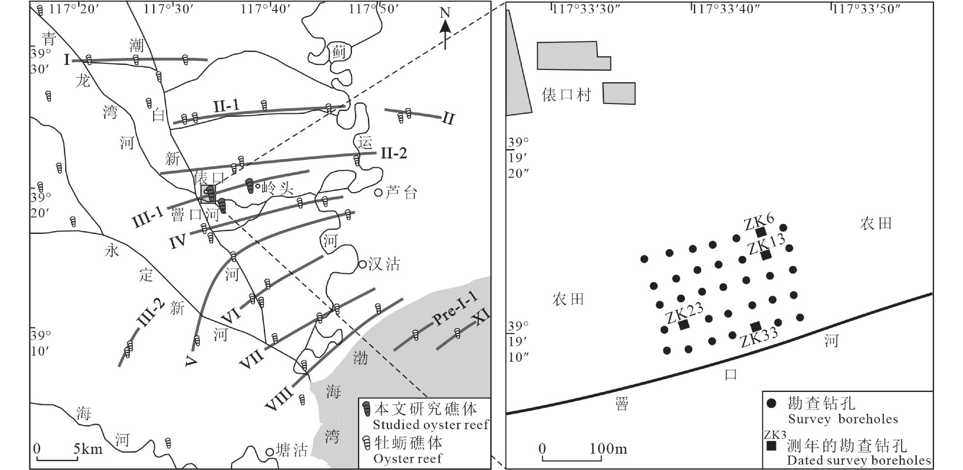 渤海湾西北部沿海平原(“牡蛎礁平原”)和毗邻浅海区的一个典型而独特的地质现象,是存在众多的全新世埋藏牡蛎礁体,目前在约3500 km2的范围内已发现了50余处,按它们的时空分布,可大致划分为10个礁群(王宏等, 2006;王海峰等, 2011;商志文等, 2013