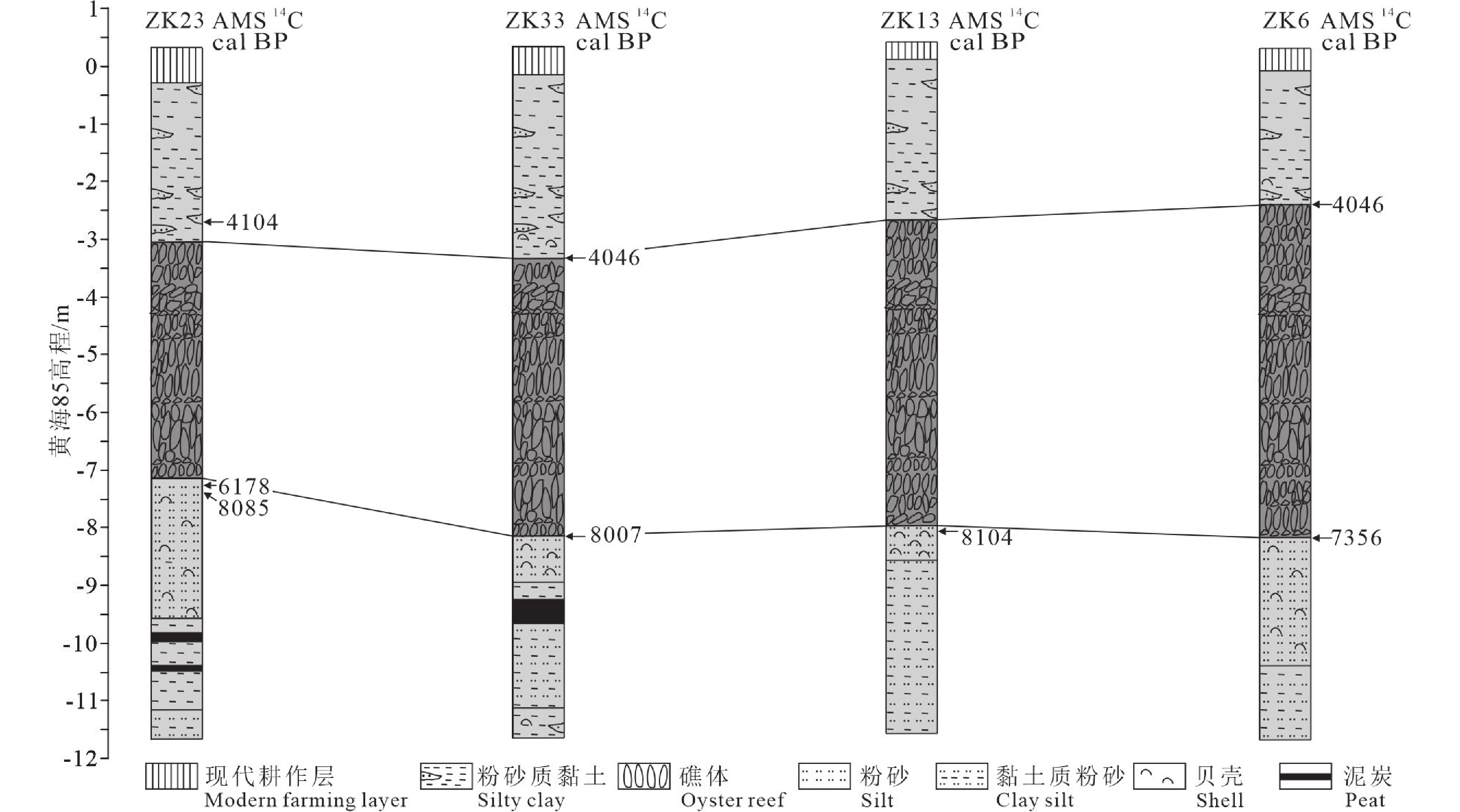 分别从俵口村南部礁体ZK6、ZK23、ZK13和ZK33钻孔上覆和下伏泥层采取8个贝壳样品用于AMS 14C年龄测定。从ZK23孔礁体上覆和下伏泥层中采集54个样品,取样间距10 cm,用于硅藻分析。