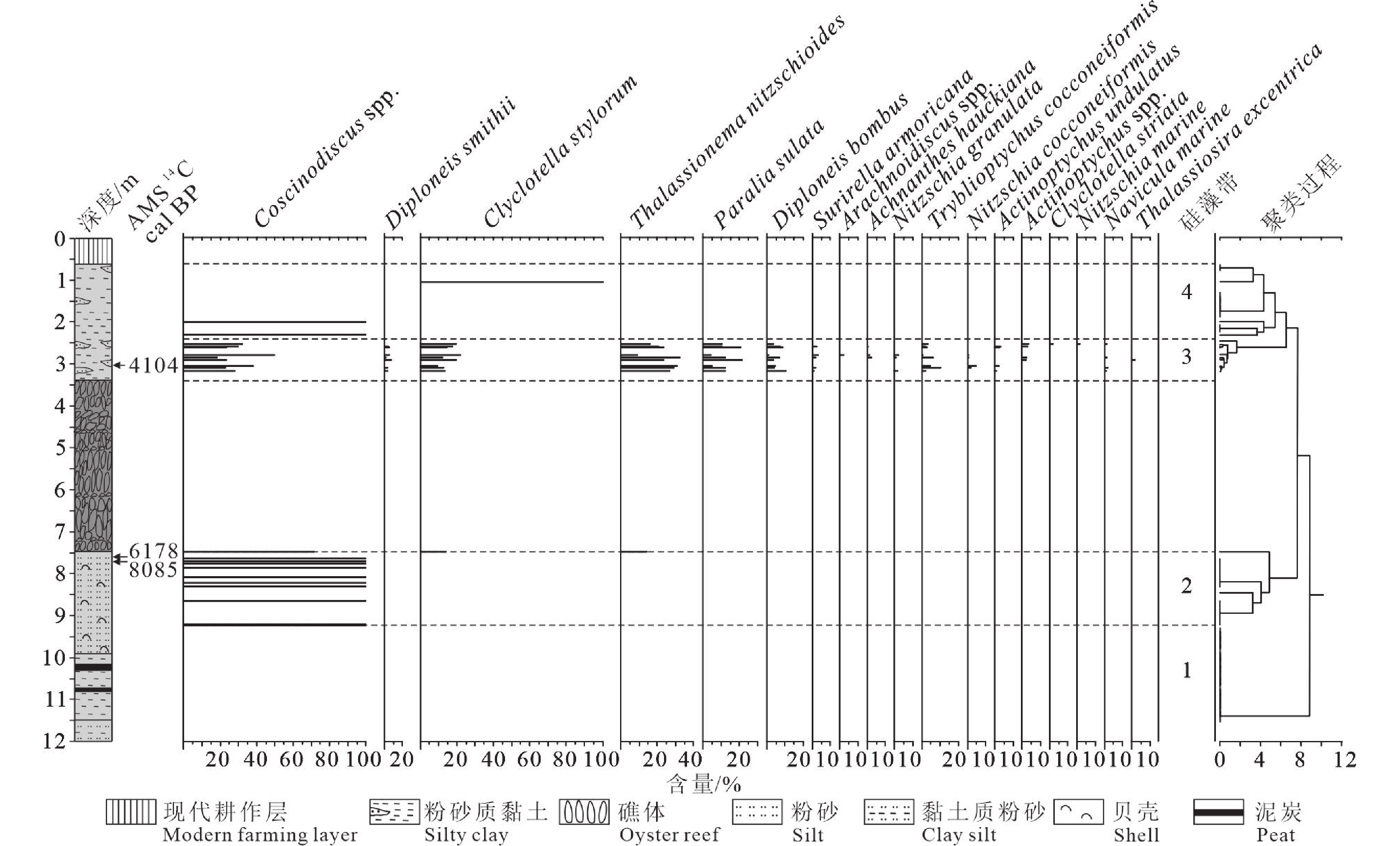 俵口南部礁体由于机械钻探过程中礁体部分受到扰动未采集样品,礁体上覆和下伏泥层样品的硅藻分析结果显示该孔共划分4个硅藻组合带(图3):组合1带,埋深9.2~12 m,其中11.5~12 m为粉砂与黏土的互层;11.5~9.9 m为粉砂质黏土,层内发育泥炭层(10.15~10.3 m)和碳质条带(10.7~10.8 m),泥炭层以泥为主,色调极黑、细腻,可见未分解的植物;9.2~9.9 m为砂泥质沉积,棕灰色(10YR 4/1),以粉砂为主,含少量泥,块状层理,含大量海相贝壳碎屑。该段未检测出硅藻,根据沉积特征推测该段为潮上带盐沼至潮间带沉积环境。组合2带,埋深7.5~9.2 m,为砂泥质沉积,棕灰色(10YR 4/1),以粉砂为主,含少量泥,块状层理,含大量海相贝壳碎屑。埋深7.70 m和7.58 m的AMS 14C年龄分别是8085 cal BP和6178 cal BP。该带仅检测出零星海相Coscinodiscus spp.硅藻碎片,推测为潮下带沉积环境。组合3带,埋深2.4~3.4 m,粉砂质黏土,棕灰色(10YR 4/1),含粉砂团,该带硅藻丰富,以Cyclotella stylorum−Coscinodiscus spp.−Thalassionema nitzschioides−Paralia sulcata为组合特征,4个优势种的含量>75%,另见沿岸种Deploneis bombus、Deploneis smithii和Surirella armoricana及近岸浅海种Tryblioptychus cocconeiformis等,该带以潮间带—近岸浅海种组合为特征,推测为潮间带沉积环境。组合4带,埋深0.7~2.4 m,粉砂质黏土,浊黄棕色(10YR 5/3),无层理,发育铁锰核和铁质浸染,可见不规则分布的粉砂团,该带仅检测出零星海相Coscinodiscus spp.硅藻碎片和Cyclotella stylorum,推测为河流泛滥形成的沼泽−盐沼环境。