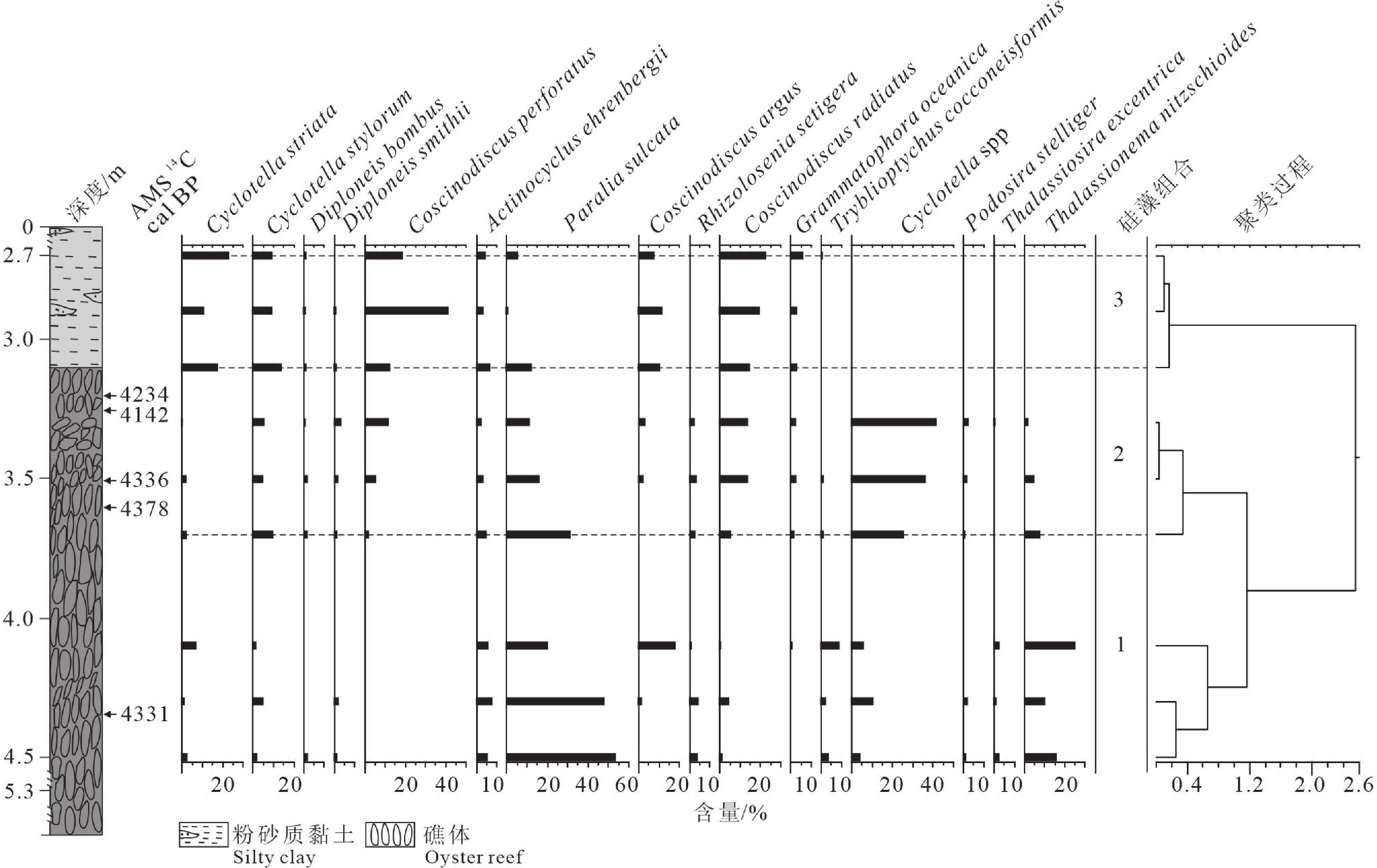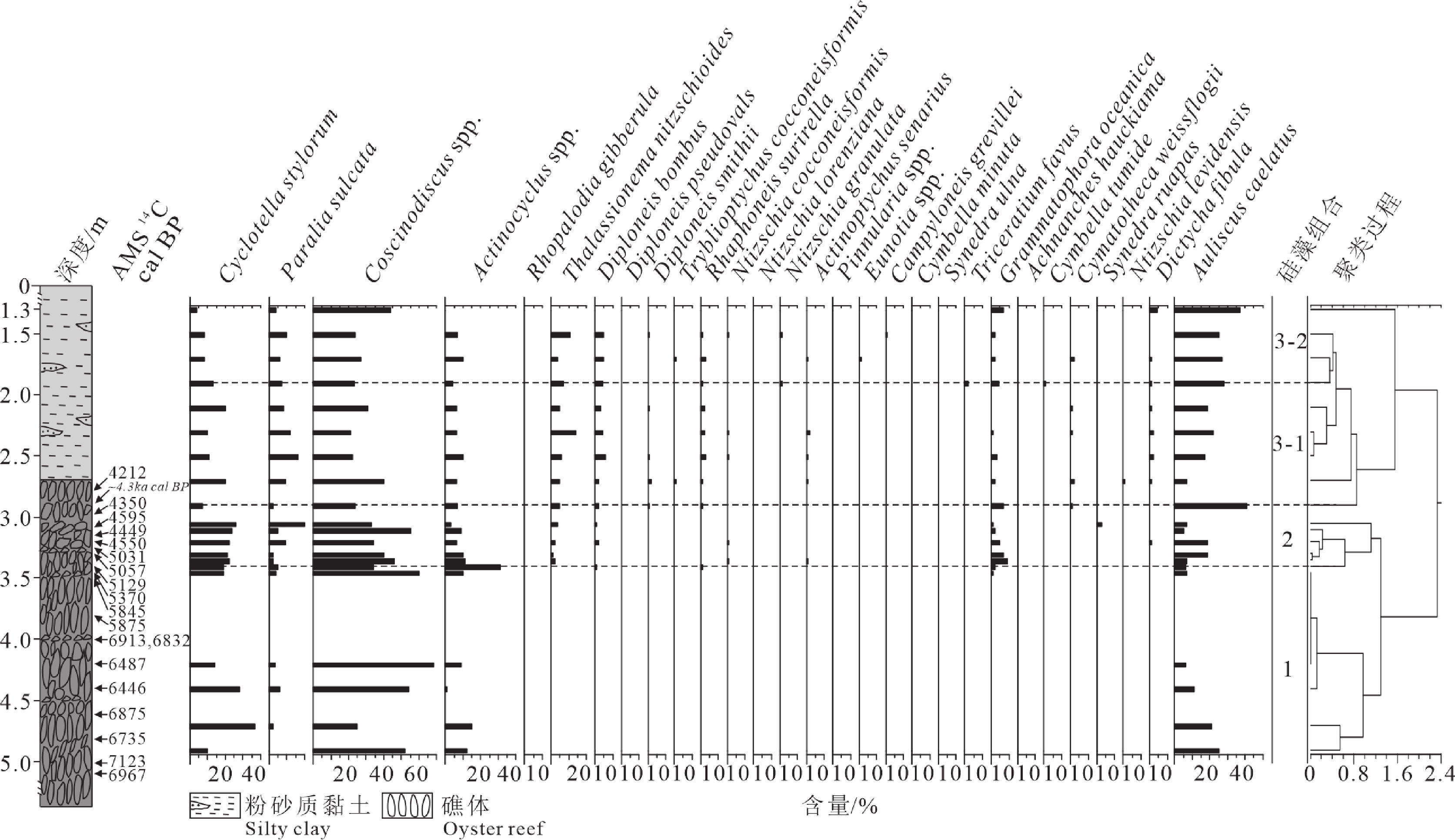 岭头礁体剖面上覆泥层和礁体内泥质样品的硅藻分析显示该剖面共划分3个硅藻组合带(图4)(商志文等, 2010b),其中组合1带埋深3.7~4.5 m(礁体下部),以近岸浅海种与海洋浮游种为主,含少量的沿岸种与非浮游种,以Paralia sulcata−Thalassionema nitzschioides−Cyclotella. spp.组合为特征,推测为潮下带至潮间带下部沉积环境。组合2带埋深3.1~3.7 m(礁体上部),以潮间带沿岸种与非浮游种为主,近岸浅海种与海洋浮游种为辅,以Cyclotella spp.−Paralia sulcata−Coscinodiscus radiatus 组合为特征,推测为潮间带中下部沉积环境。组合3带,埋深2.7~3.1 m(礁体上覆泥层),以潮间带沿岸种与非浮游种为主,含少量浅海种和浮游种,以Cyclotella striata/stylorum−Coscinodiscus perforatus−Coscinodiscus radiatus组合为特征,推测为潮间带中上部环境。