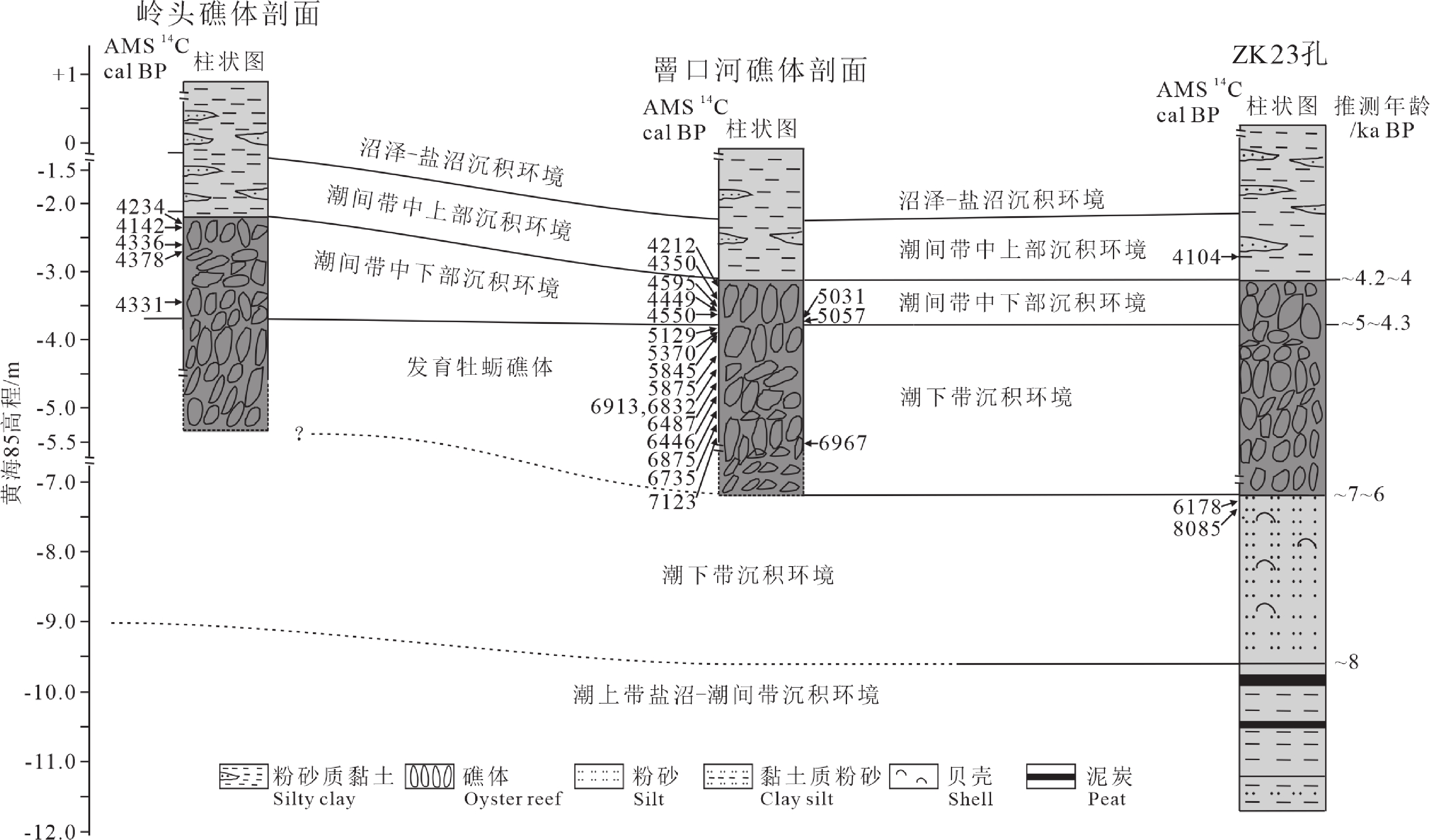 俵口南部、岭头和罾口河3处埋藏牡蛎礁体硅藻、加速器14C测年和沉积学古环境重建的联合剖面结果(图6)显示,研究区早全新世为潮上带盐沼至潮间带沉积环境,发育泥炭层。约8 ka cal BP以后,随着海面快速上升,全新世海侵逐渐达到向陆进侵的最大边界,研究区进入潮下带沉积环境,在约7 ka cal BP以来,俵口南部、岭头和罾口河3处牡蛎礁体先后出现。礁体初期生长在低潮线以下的浅水环境,随着礁体的向上建造水深逐渐变浅,海水影响减弱,在5~4.3 ka cal BP时,礁体进入潮间带中下部,并在4.2~4 ka cal BP时被上覆泥层覆盖,停止发育。之后,研究区逐渐脱离海水影响,由潮间带中上部进入沼泽−盐沼相沿海低地沉积环境并相继成陆。