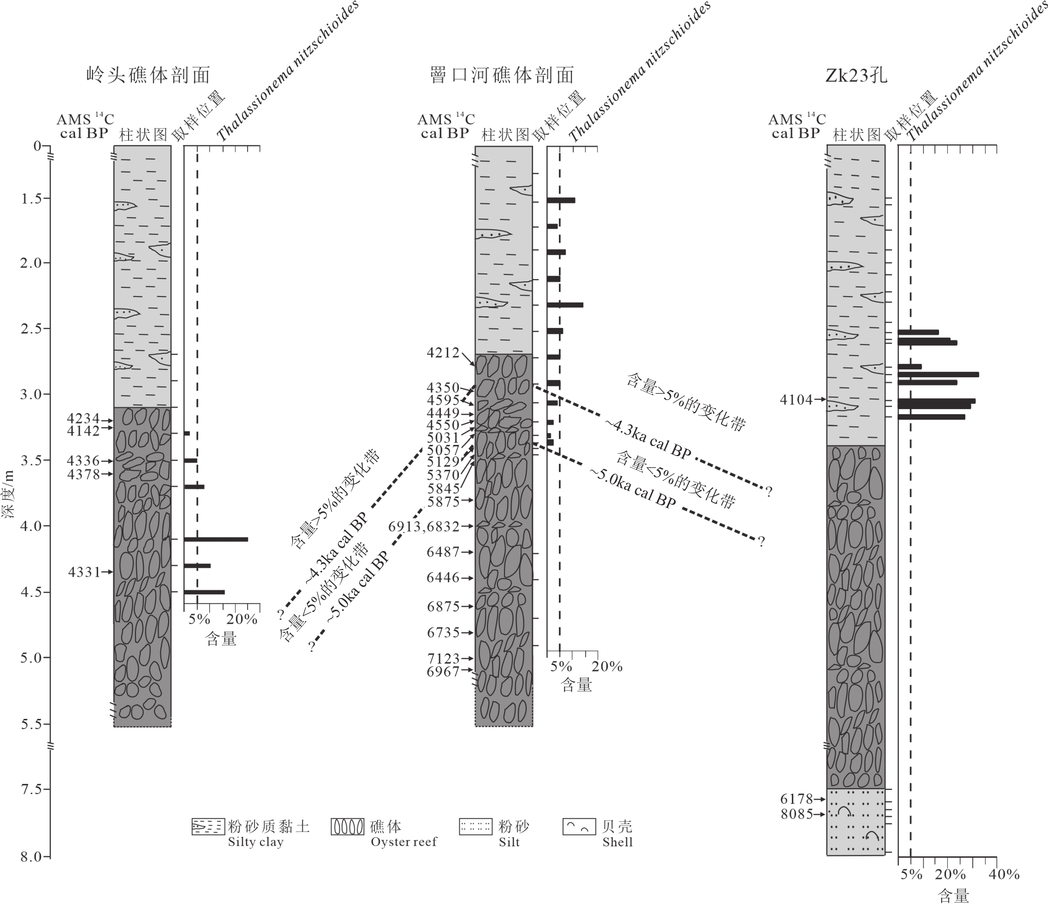 岭头、罾口河和俵口南部礁体年龄与Thalassionema nitzschioides含量分布图(图7)显示,在5~4.3 ka cal BP期间,Thalassionema nitzschioides含量<5%。4.3 ka cal BP后,该种的含量明显增加,为5%~30%。推测在5~4.3 ka cal BP时,研究区海水温度相对较低,抑制了Thalassionema nitzschioides种群增长,导致其在研究区硅藻群落中百分含量较低。4.3 ka cal BP后,海水温度相对升高,促进了Thalassionema nitzschioides种群增长,种群密度增大,进而增加了其在研究区硅藻群落中的百分含量。进一步推测研究区在5~4 ka cal BP发生了一次气候变化过程:在5~4.3 ka cal BP期间相对寒冷,4.3 ka cal BP后逐渐转暖,牡蛎礁及上覆泥层内硅藻记录的气候变化事件的转折点发生于约4.3 ka cal BP。